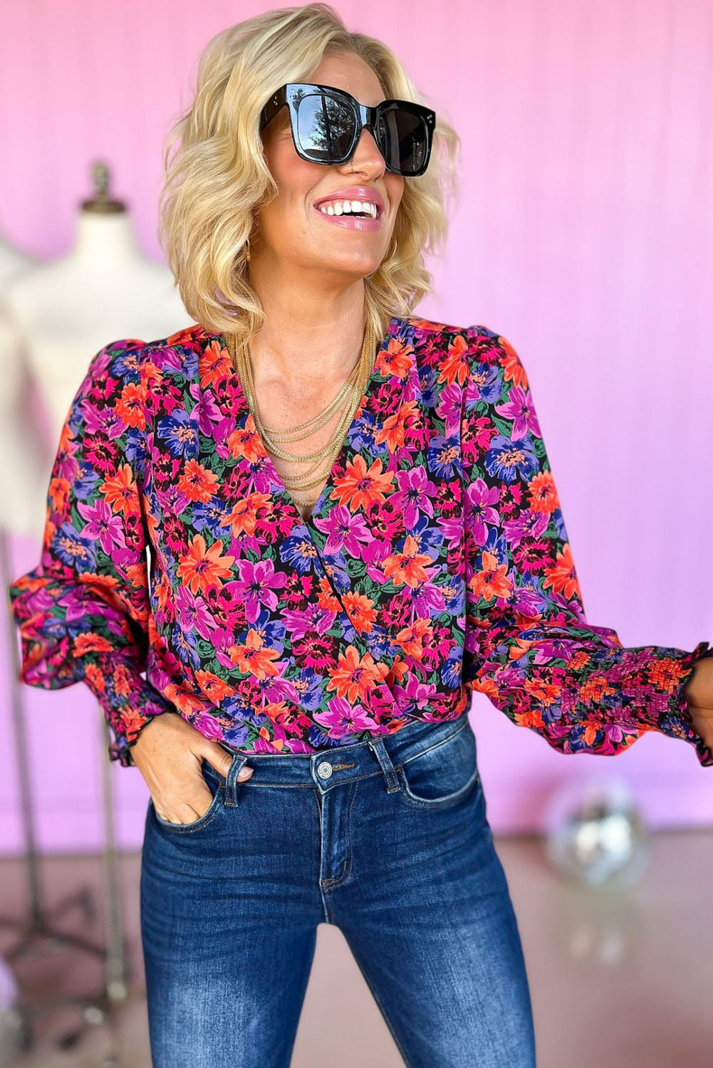 Floral Print Wrap V Neck Long Sleeve Bodysuit