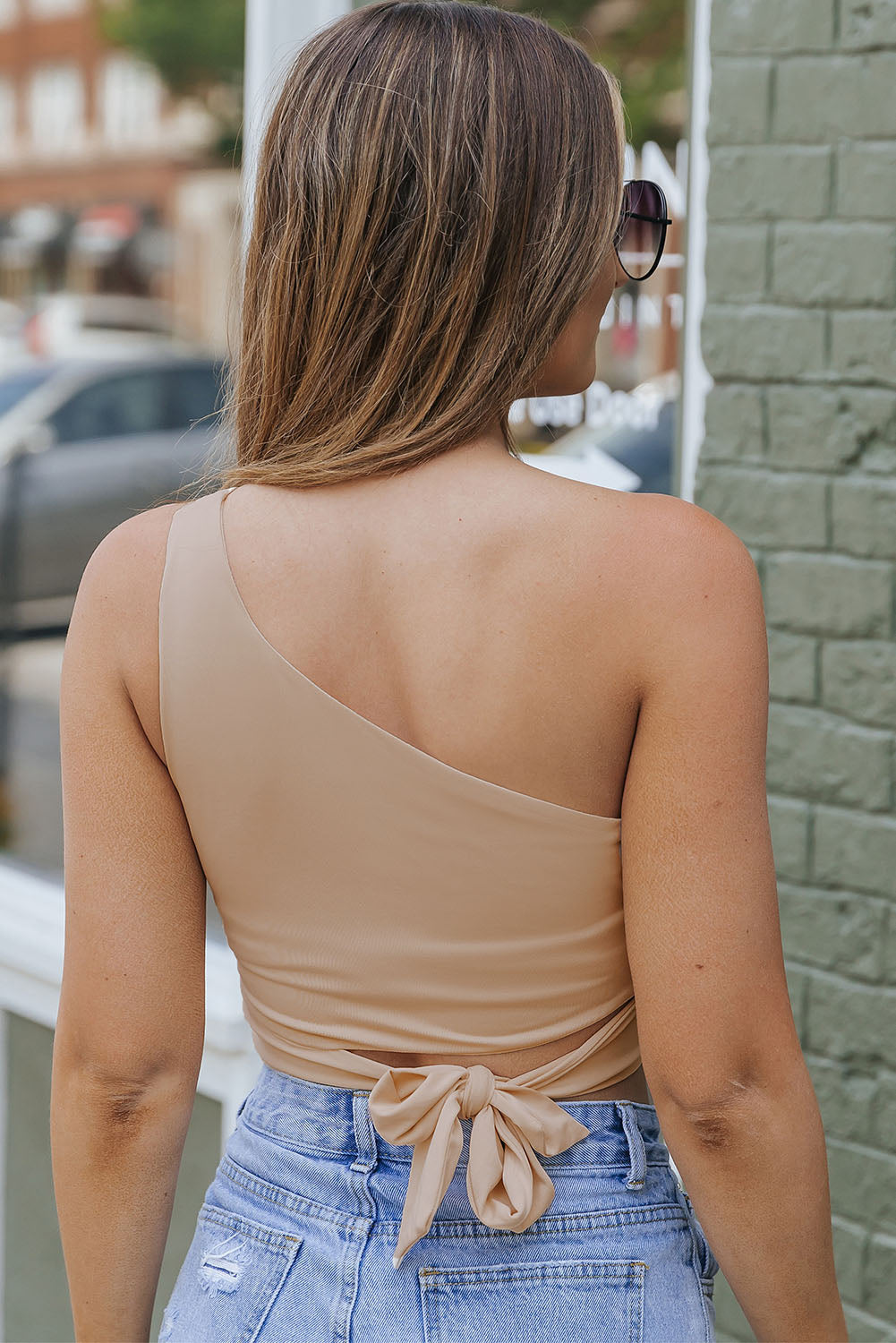 Khaki One Shoulder Side Tie Sleeveless Crop Top