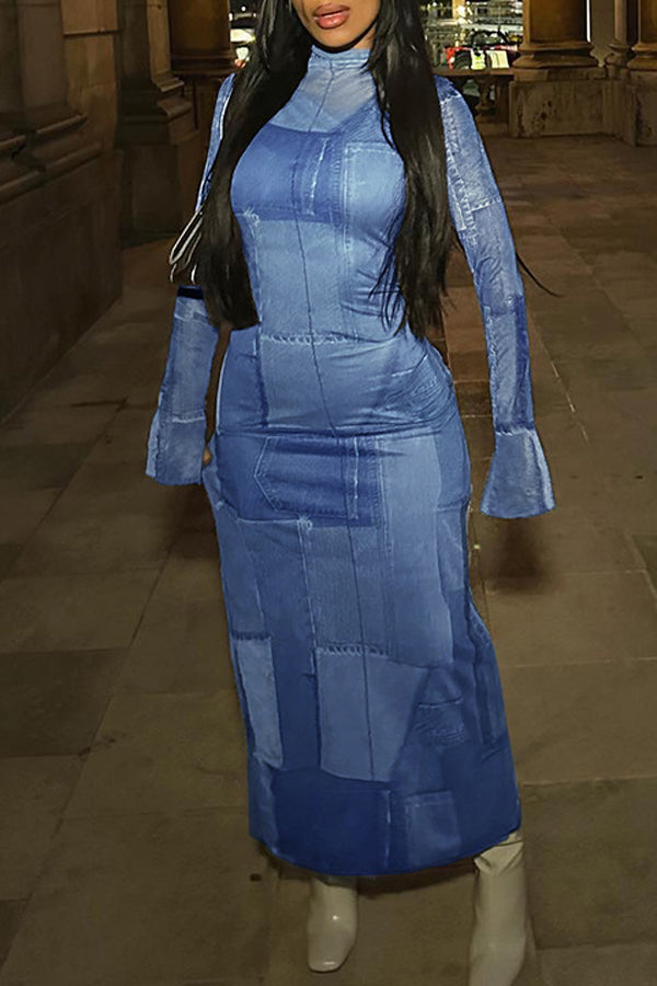 Fashion Distressed Denim Print High Neck Stretch Slim Maxi Dress