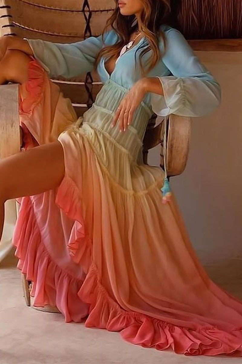 Elegant Gradual Change Patchwork Frenulum V Neck Printed Dress Dresses