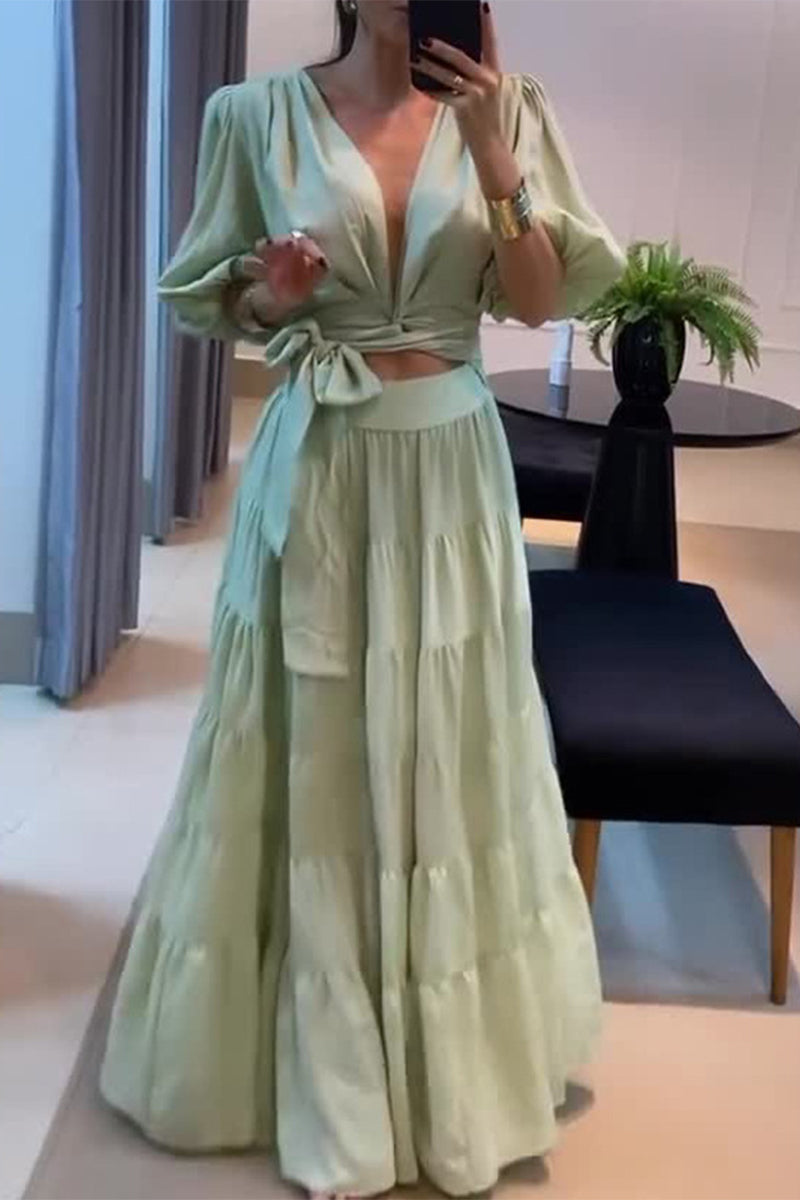 Elegant Simplicity Solid Frenulum V Neck Half Sleeve Two Pieces