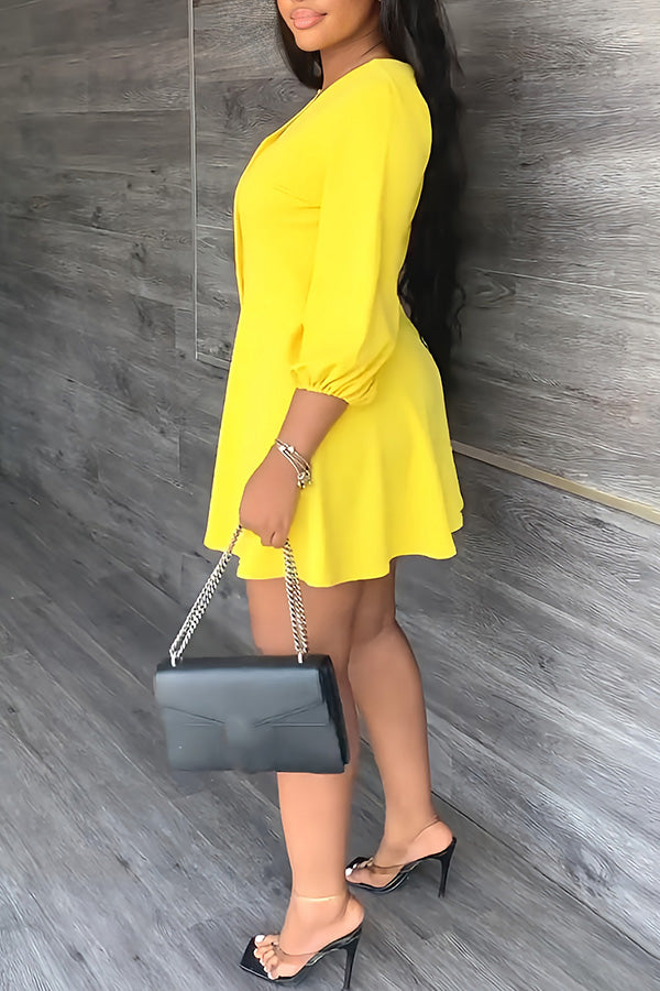 Elegant Puff Sleeve Satin Solid Color Ruffle Lace-Up Mini Dress