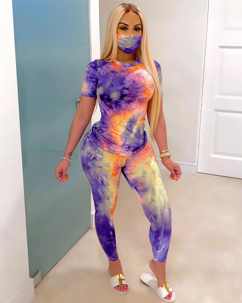 Tie Dye Short Sleeve Top & Pants Set With Mask