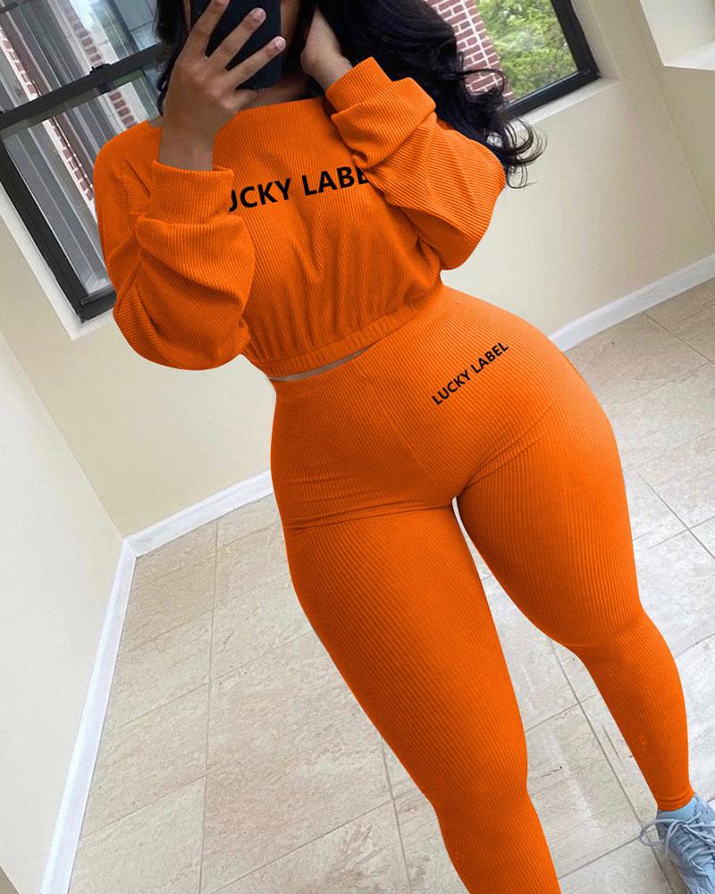 Letter Print Ribbed Crop Top & Pants Set