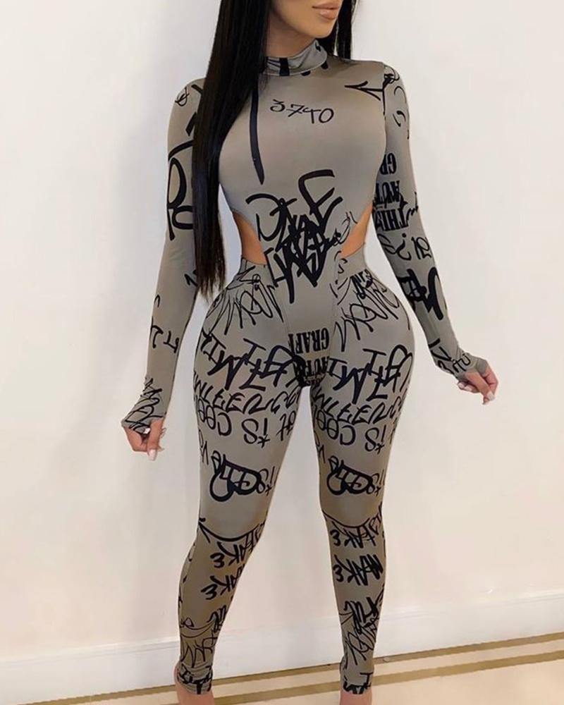 Letter Print Thumb Holes Zip Back Bodysuit & Pants Set