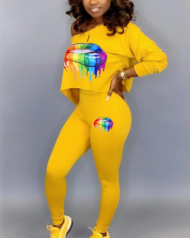 Lips Print Boat Neck Top & Pants Set