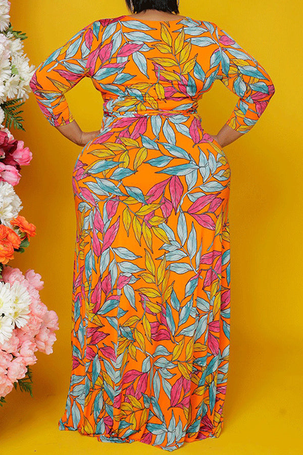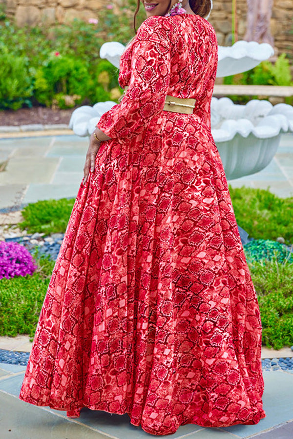 Fashion Plus Size Snake Print Long Sleeve V-neck Maxi Dress (Without Belt)