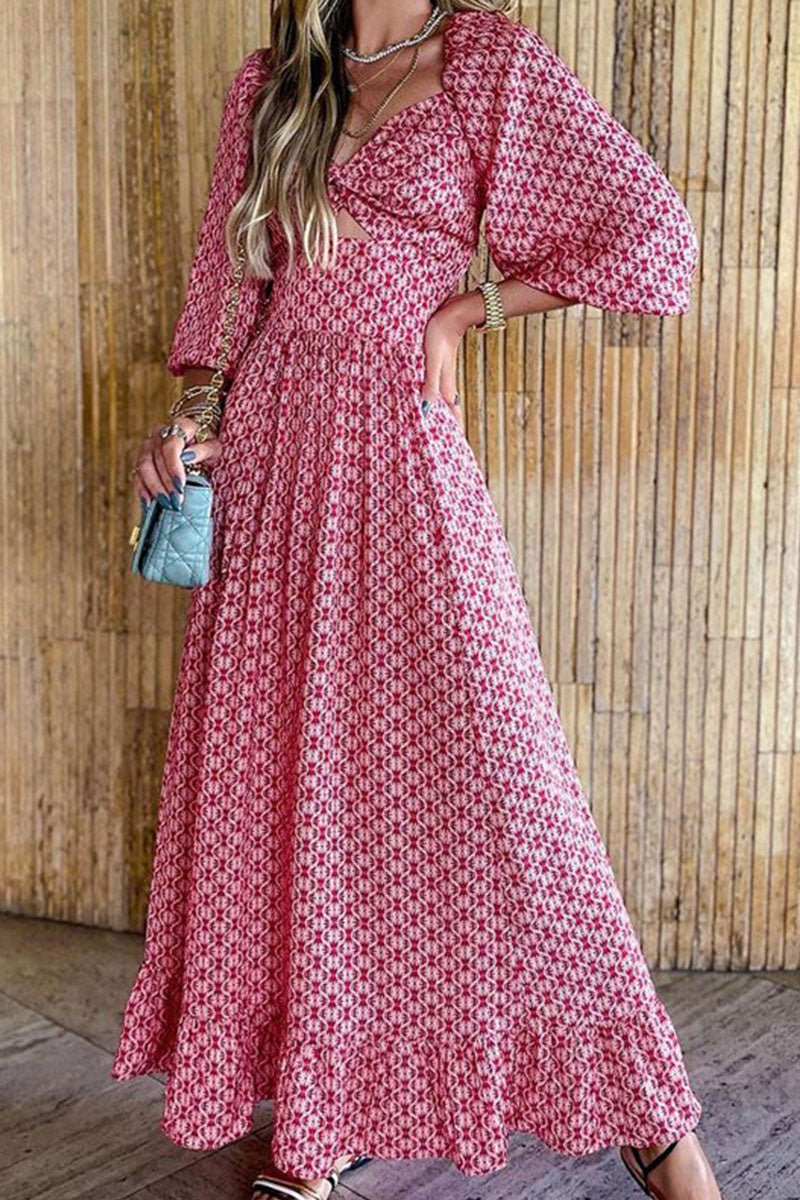 Casual Print Hollowed Out O Neck A Line Dresses