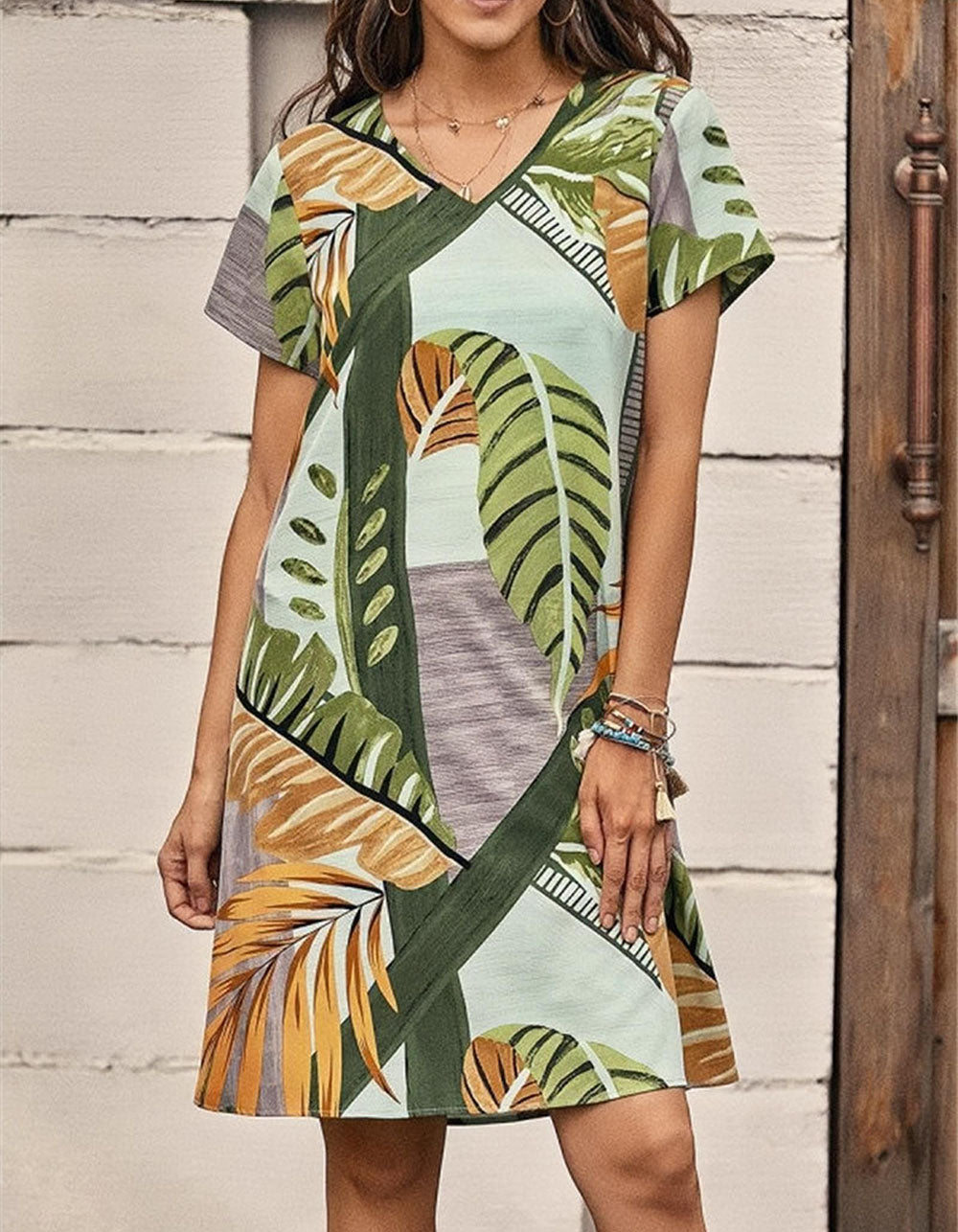 Plants Printed V Neck Short Sleeve Short A-Line Dresses