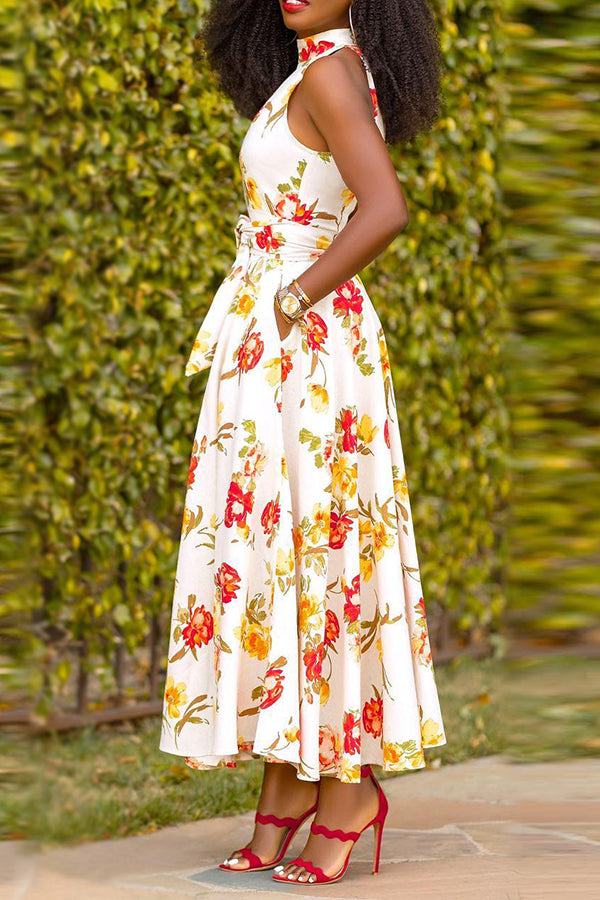 Romantic Print Puff Sleeve Shirt Collar Lace-Up Maxi Dress