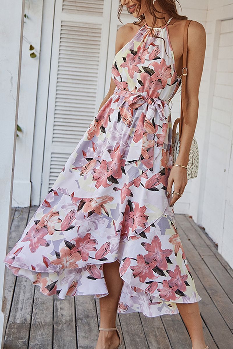 Allover Print Belted Ruffle Hem Maxi Dress