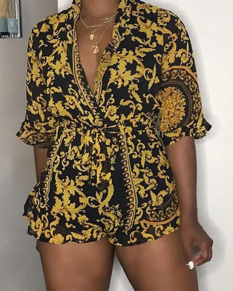 Allover Print Ruffle Hem Self-Tie Wide Leg Casual Romper