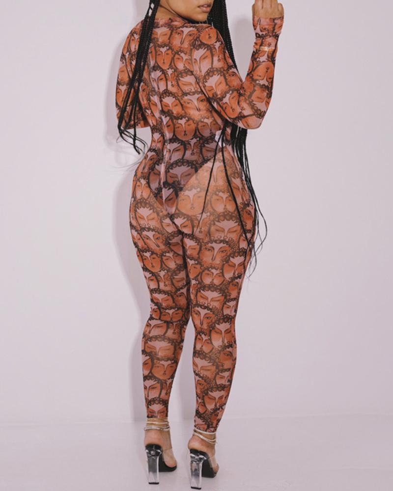 Figure Print Sheer Mesh Casual Jumpsuit Without Panty