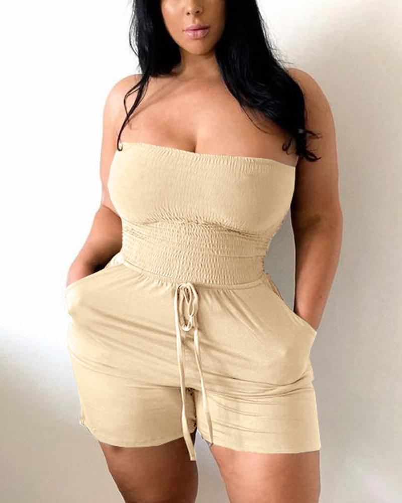 Solid Shirred Drawstring Waist Slant Pocket Tube Casual Romper