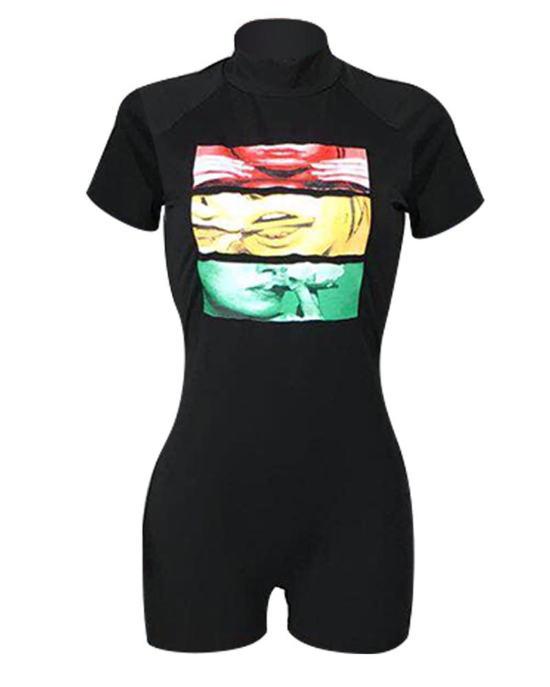 Colorblock & Figure Pattern Print Mock Neck Casual Romper