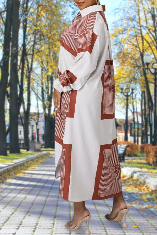 Temperament Geometric Print Long Sleeve Shirt Collar Midi Dress Without Belt