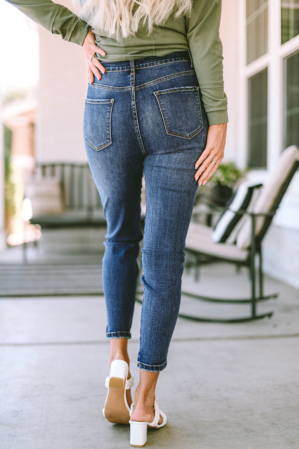 Sky Blue High Rise Button Front Frayed Ankle Skinny Jeans