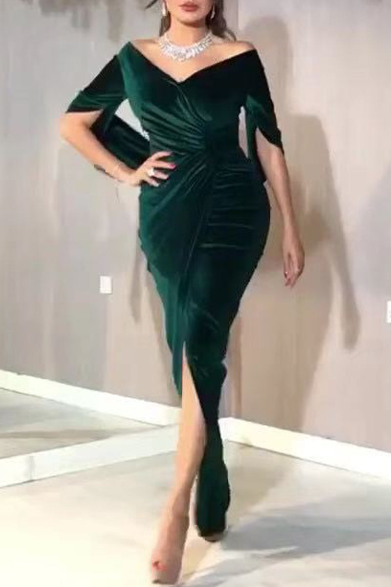 Elegant Formal Solid Slit Fold V Neck Evening Dress Dresses