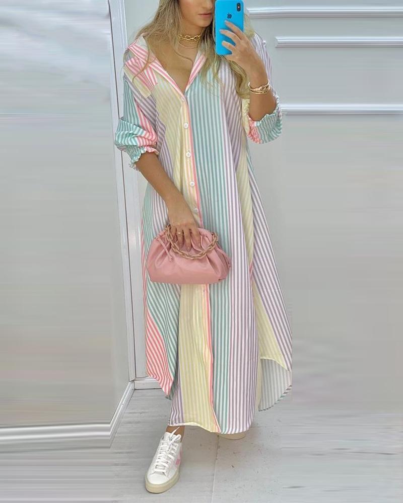 Colorful Stripe Print Button Front High Slit Long Shirt Dress