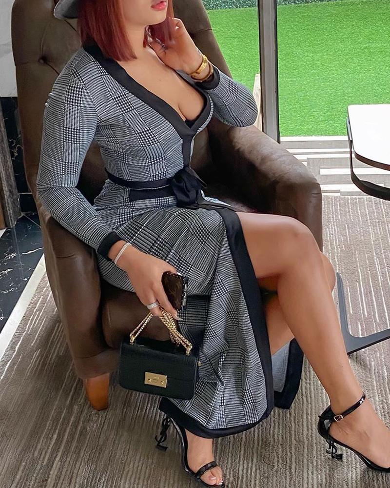 High Slit Plaid Long Sleeve Plunge Maxi Dress