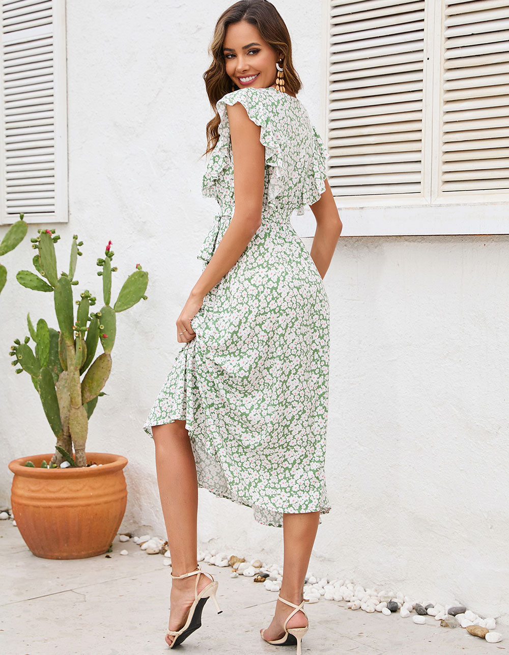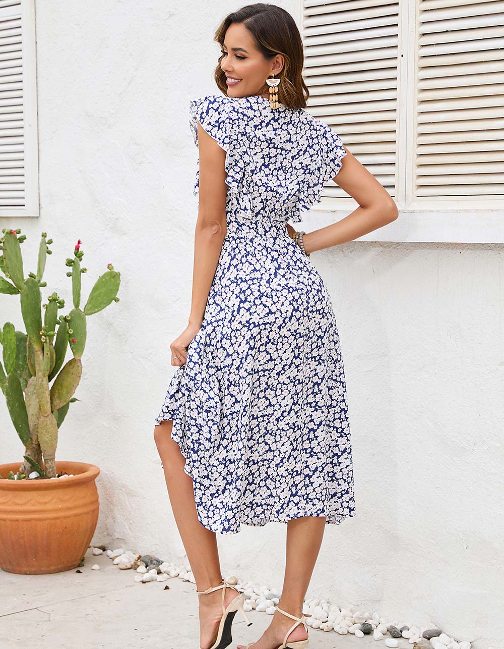 Disty Floral Print V Neck Short Sleeve Slits Long A-Line Dresses