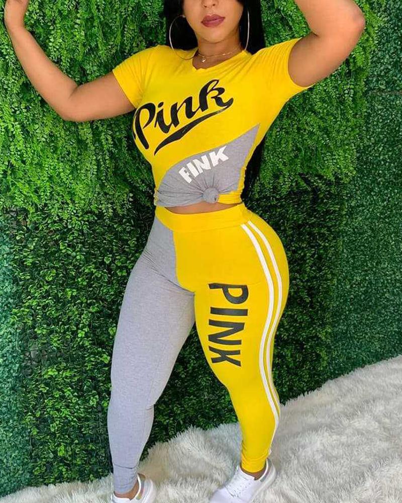 Colorblock Letter Print Contrast Binding Tee & Pants Set