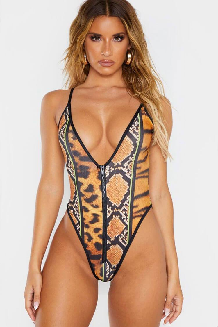 Wild vibes two piece swimsuit featuring a plunging neckline styling with zipper trim on the front, padding cups, the matching high cut bottom and a crop top with short sleeves. Allover in snake and leopard print.