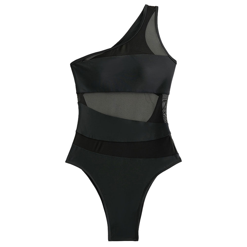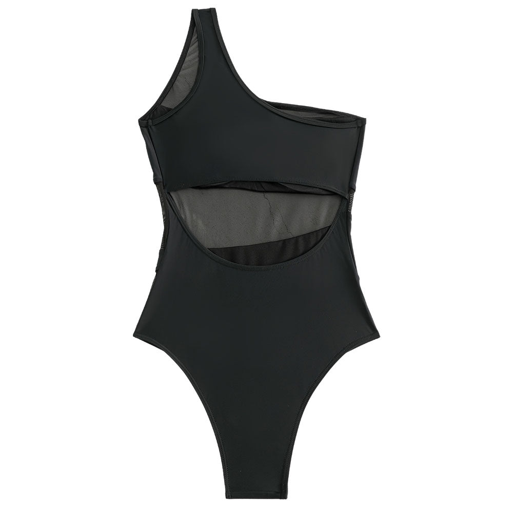 Be bold, be beautiful with our striking all-black one-piece swimsuit. It combines timeless elegance with contemporary allure. Our asymmetrical one-shoulder swimsuit is designed to make you stand out on the beach or by the pool. Featuring an eye-catching single shoulder strap, a tantalizing cutout back, and sheer mesh panels, this sexy bathing suit lets you embrace your confidence and express your unique style. Customize your comfort with removable soft pads and elevate your beach-side glamour.