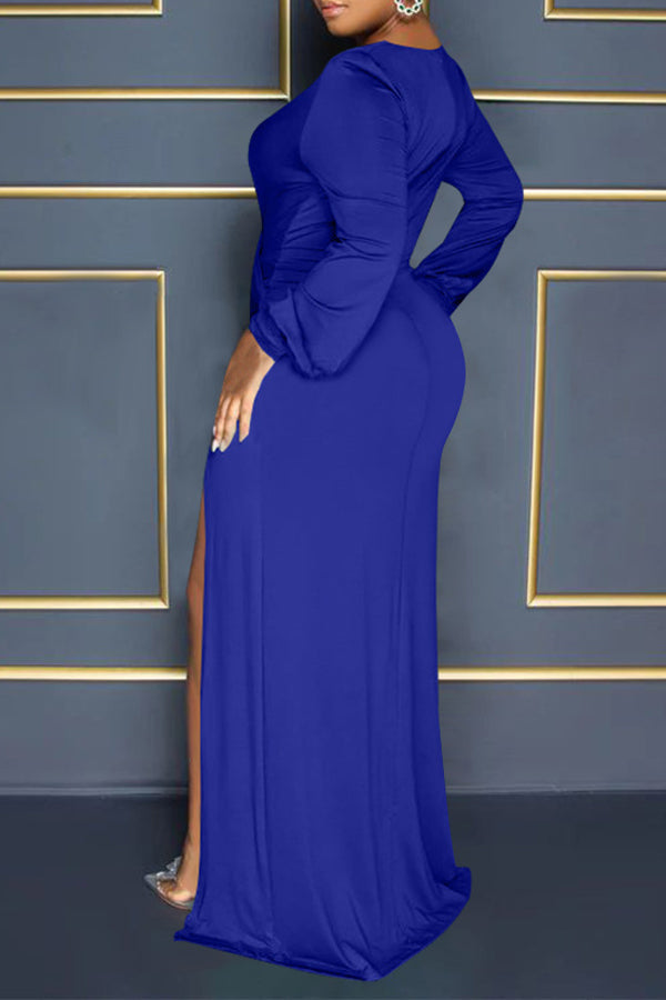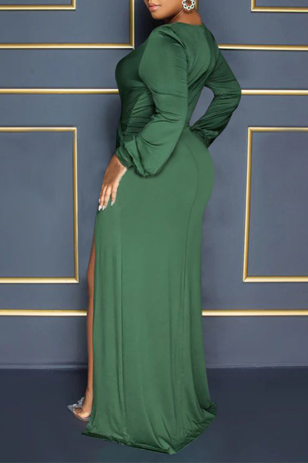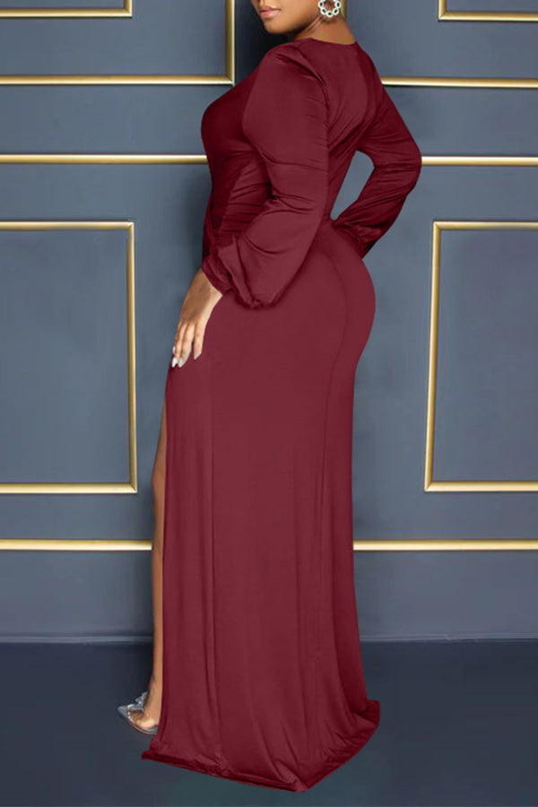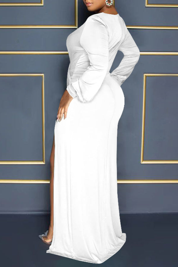 Balloon Sleeve V Neck Solid Color Slit Maxi Dress