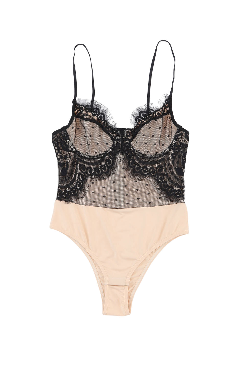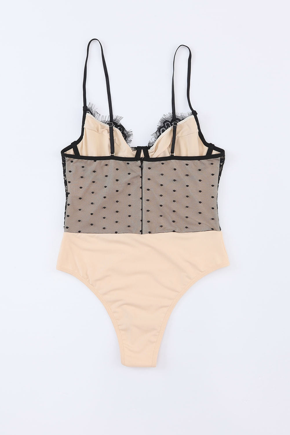 Black Eyelash Lace Trim Dotty Mesh Bodysuit