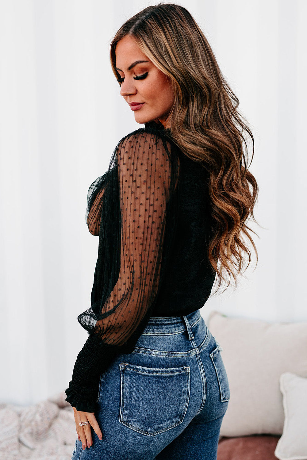 • The dotty mesh sleeves are puffy with shirred cuffs