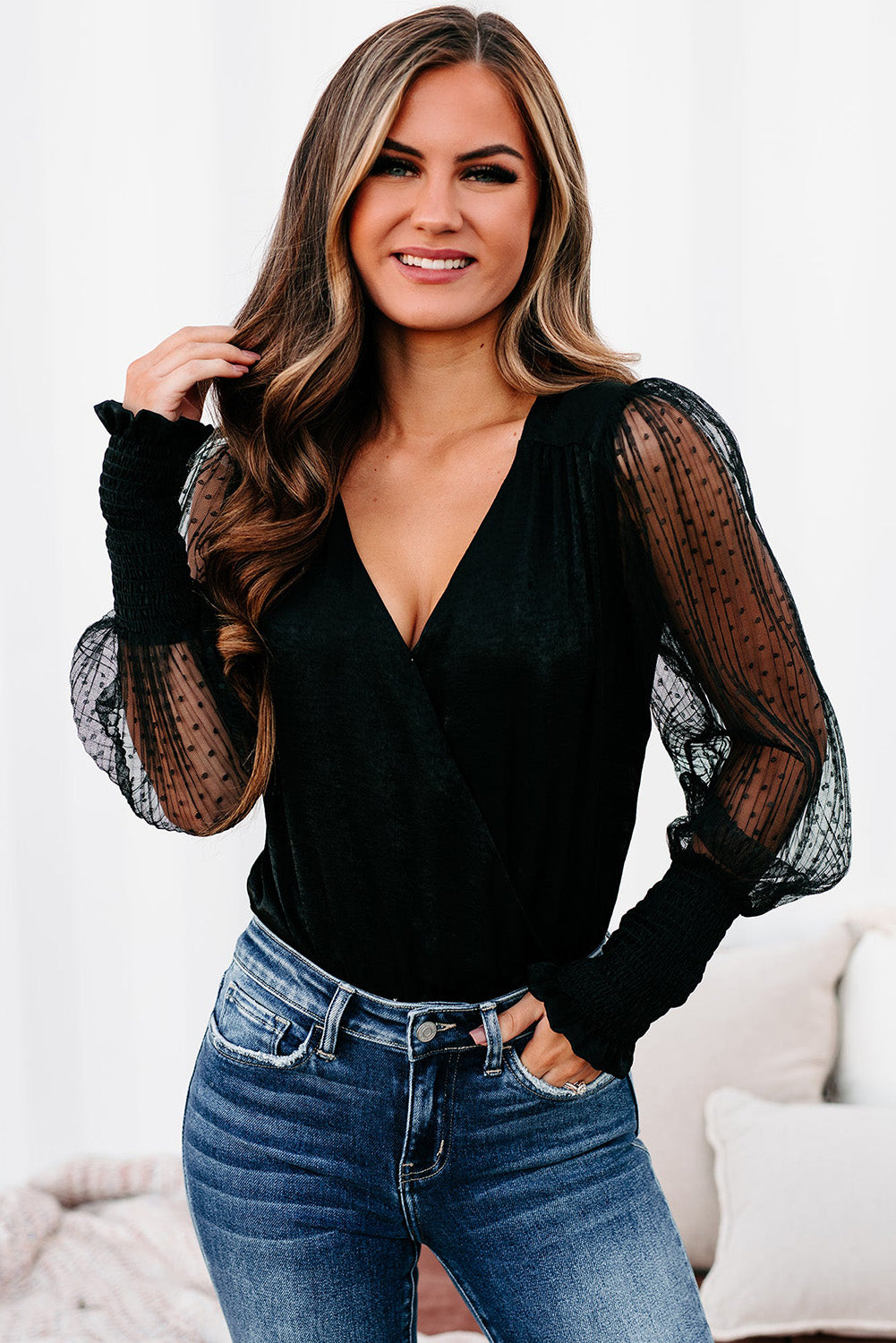 Black Mesh Long Sleeve Surplice Bodysuit
