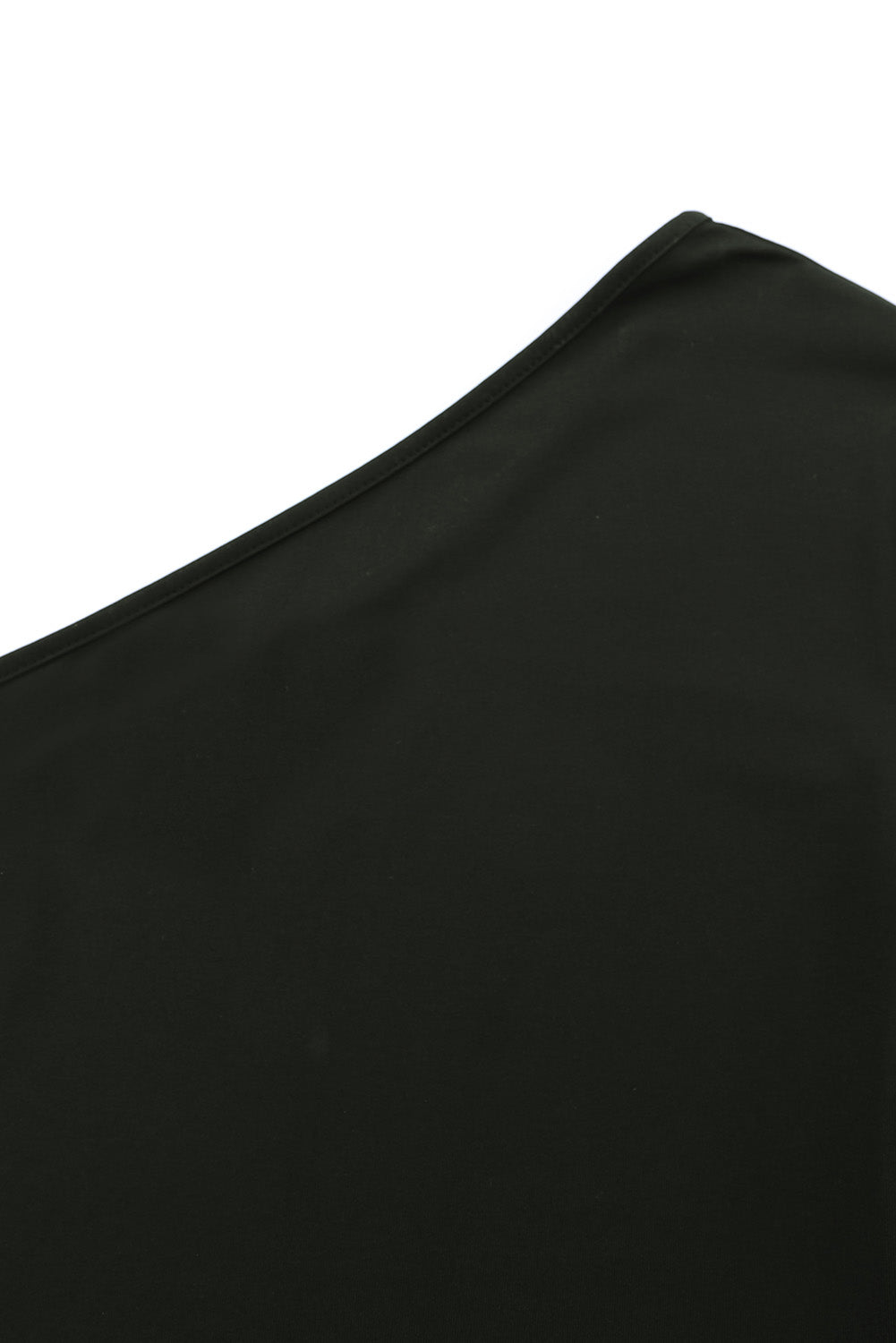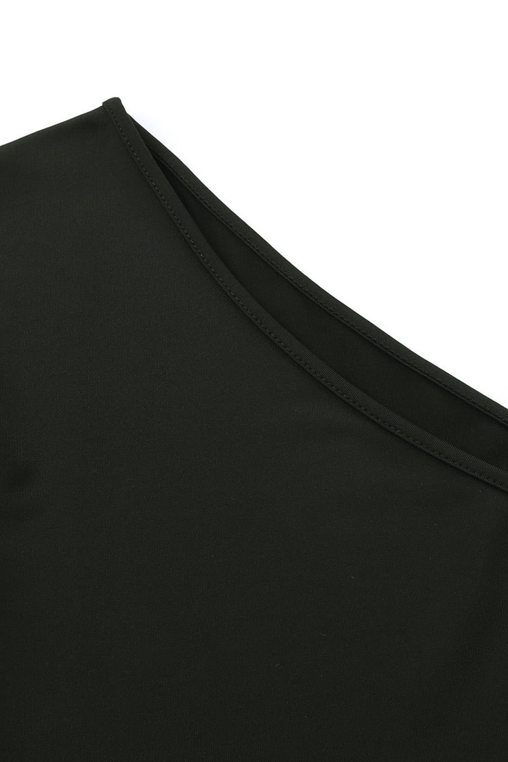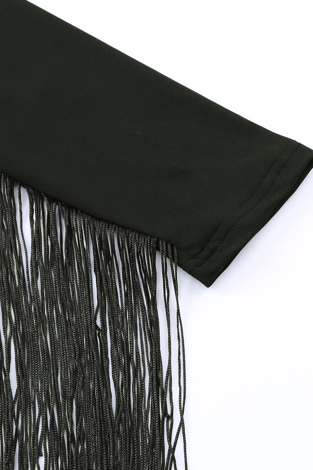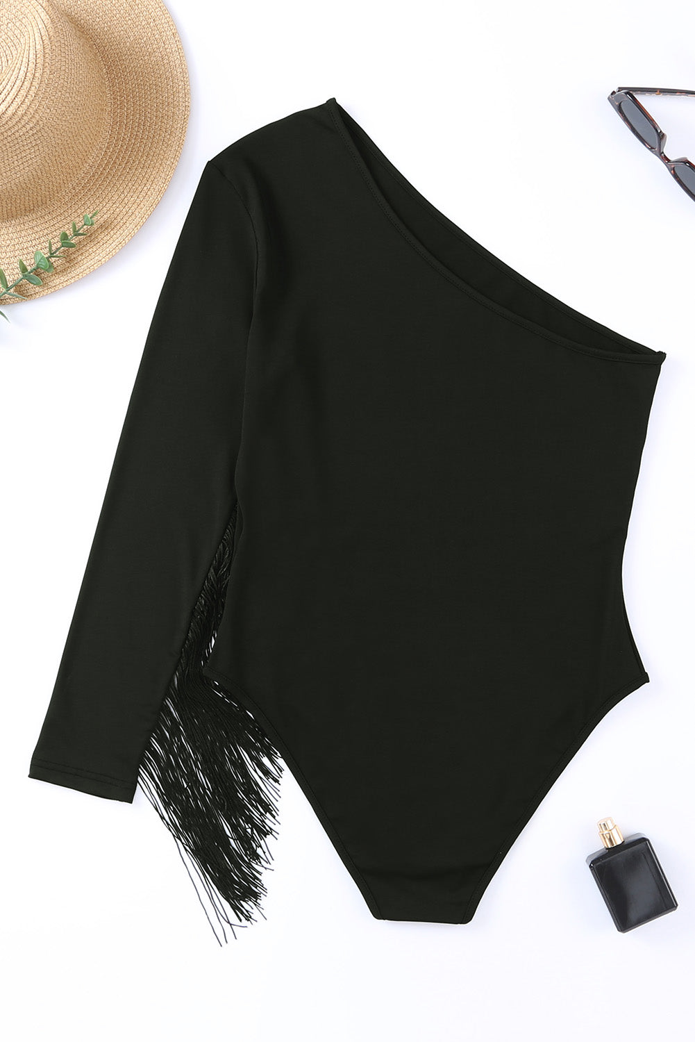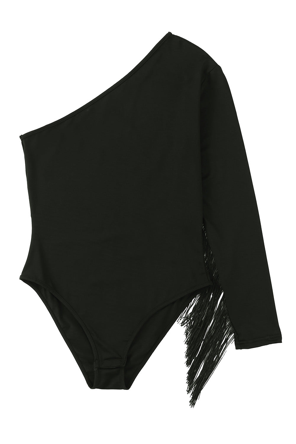 Black One Shoulder Fringed Long Sleeve Bodysuit