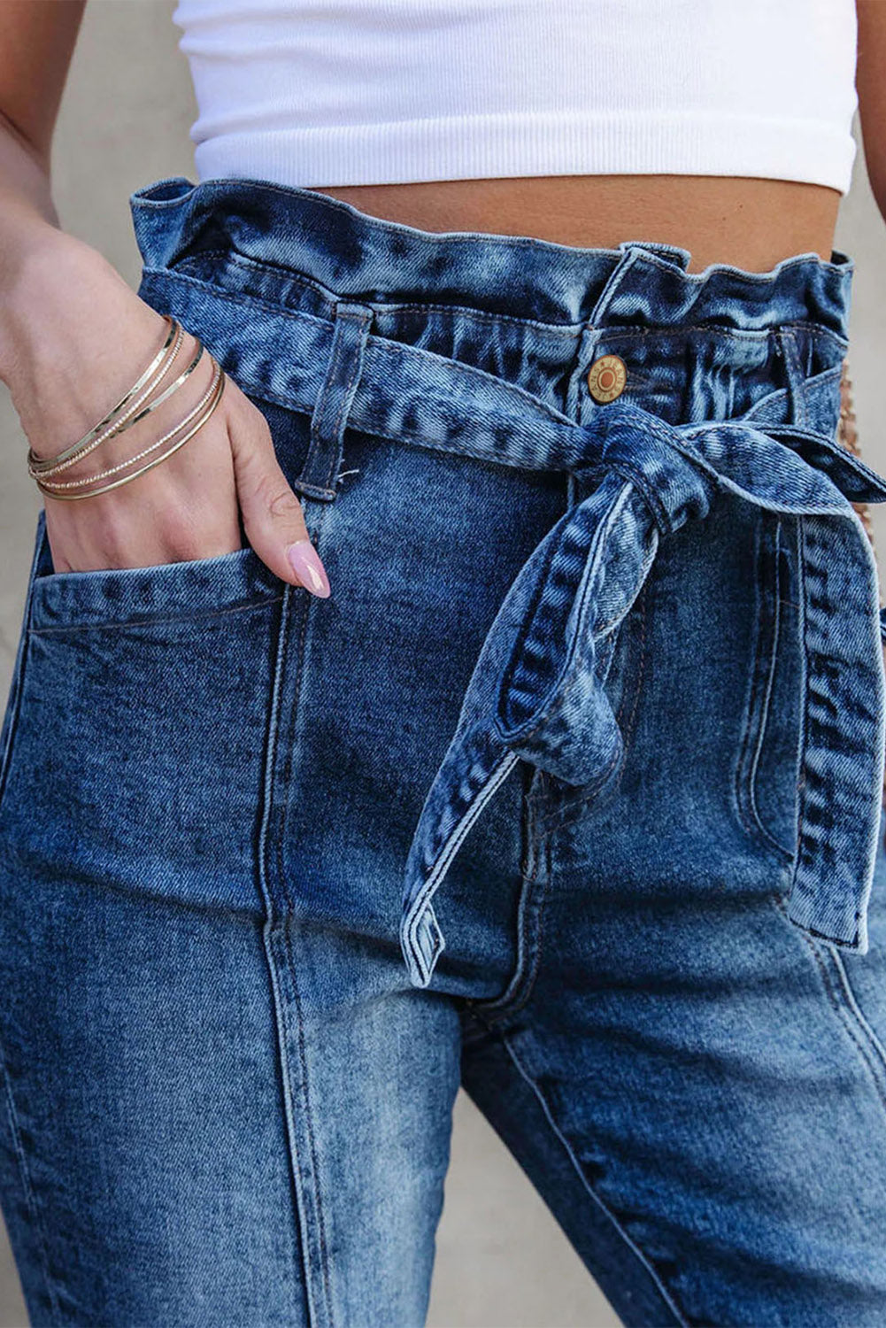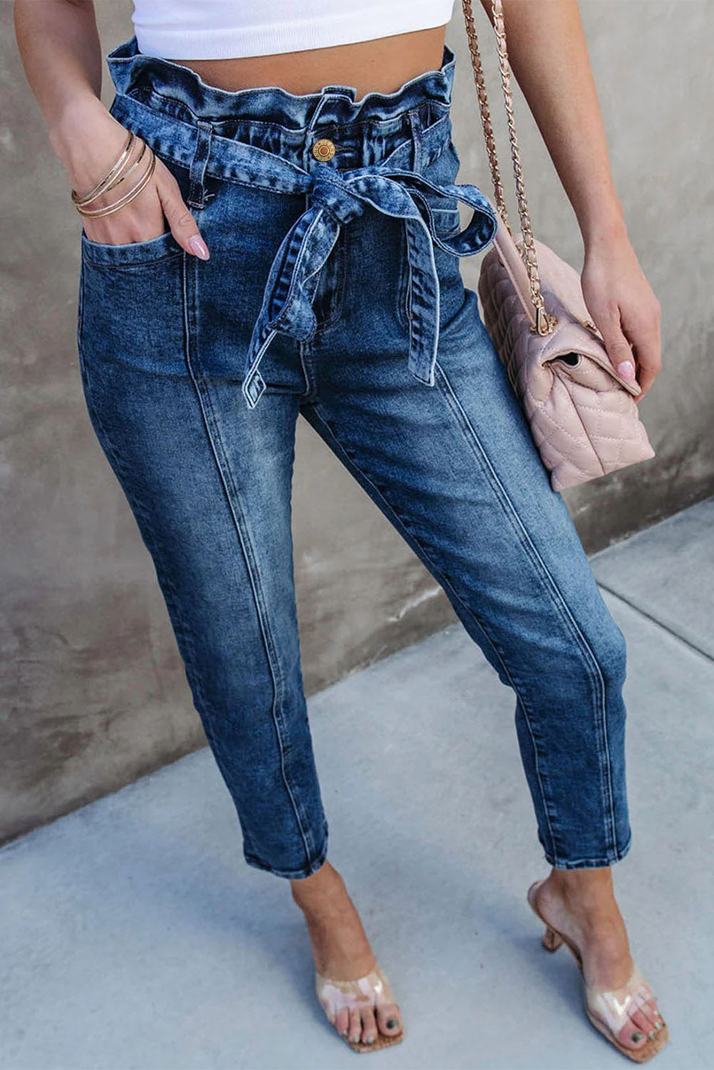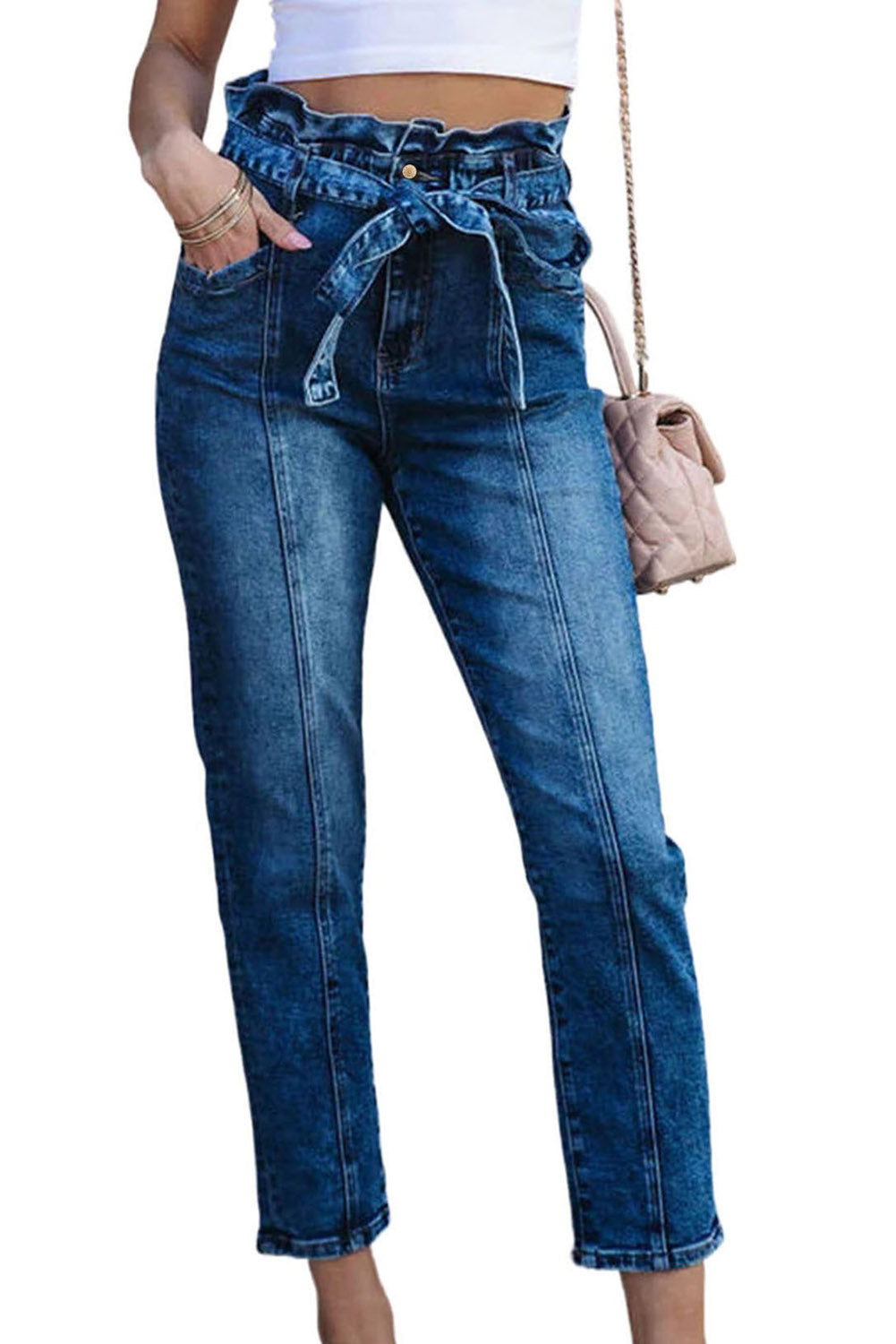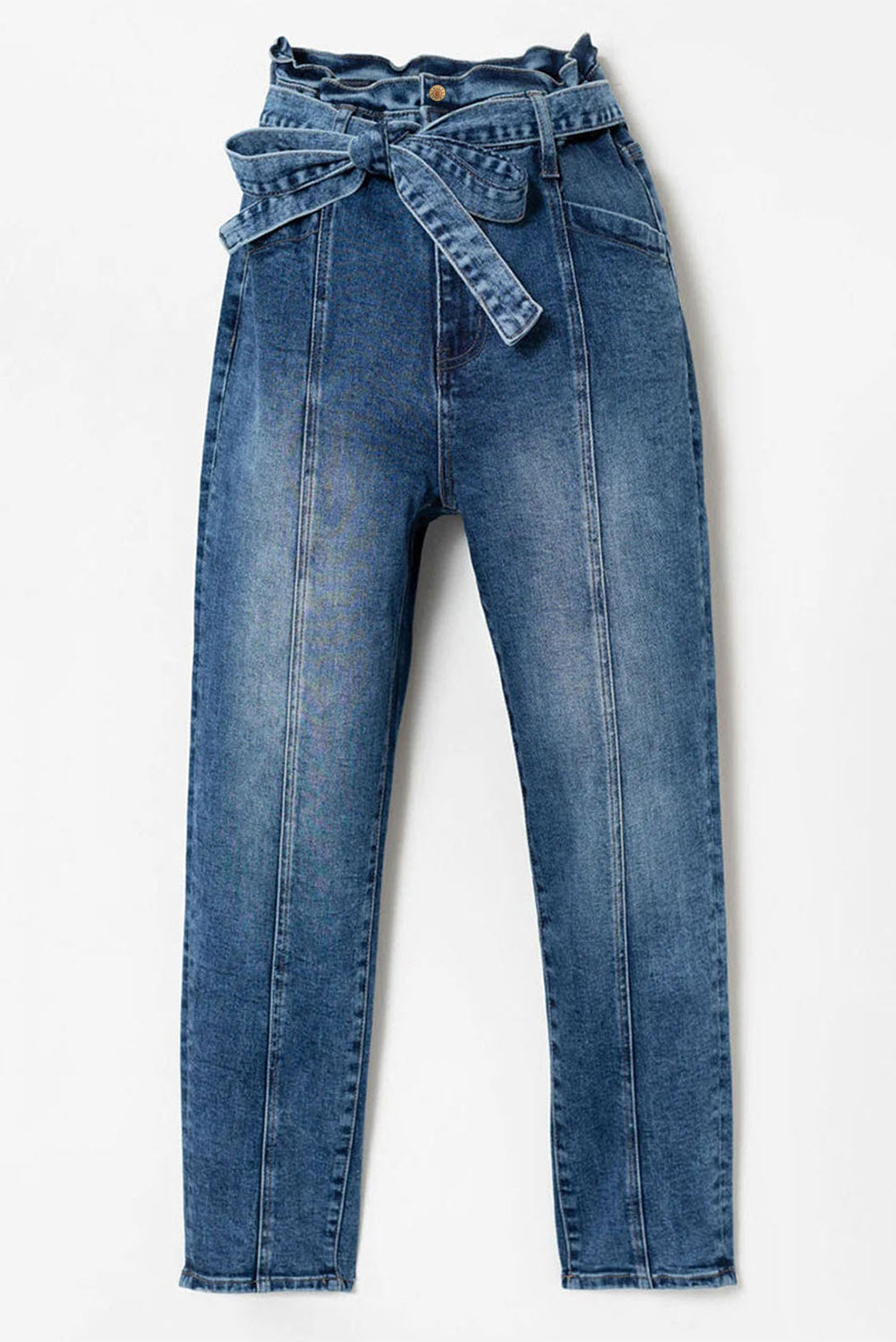 Blue Seamed Stitching High Waist Knot Skinny Jeans
