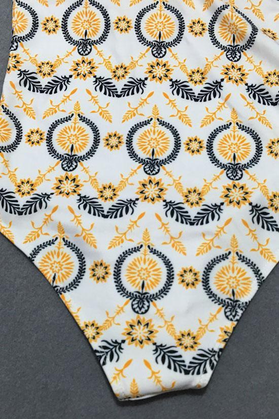 Ethnic one piece Swimsuit featuring high neck with padded cups, elastic shoulder straps, low scoop back and brief-cut leg design bottom. Allover in ethnic printed.