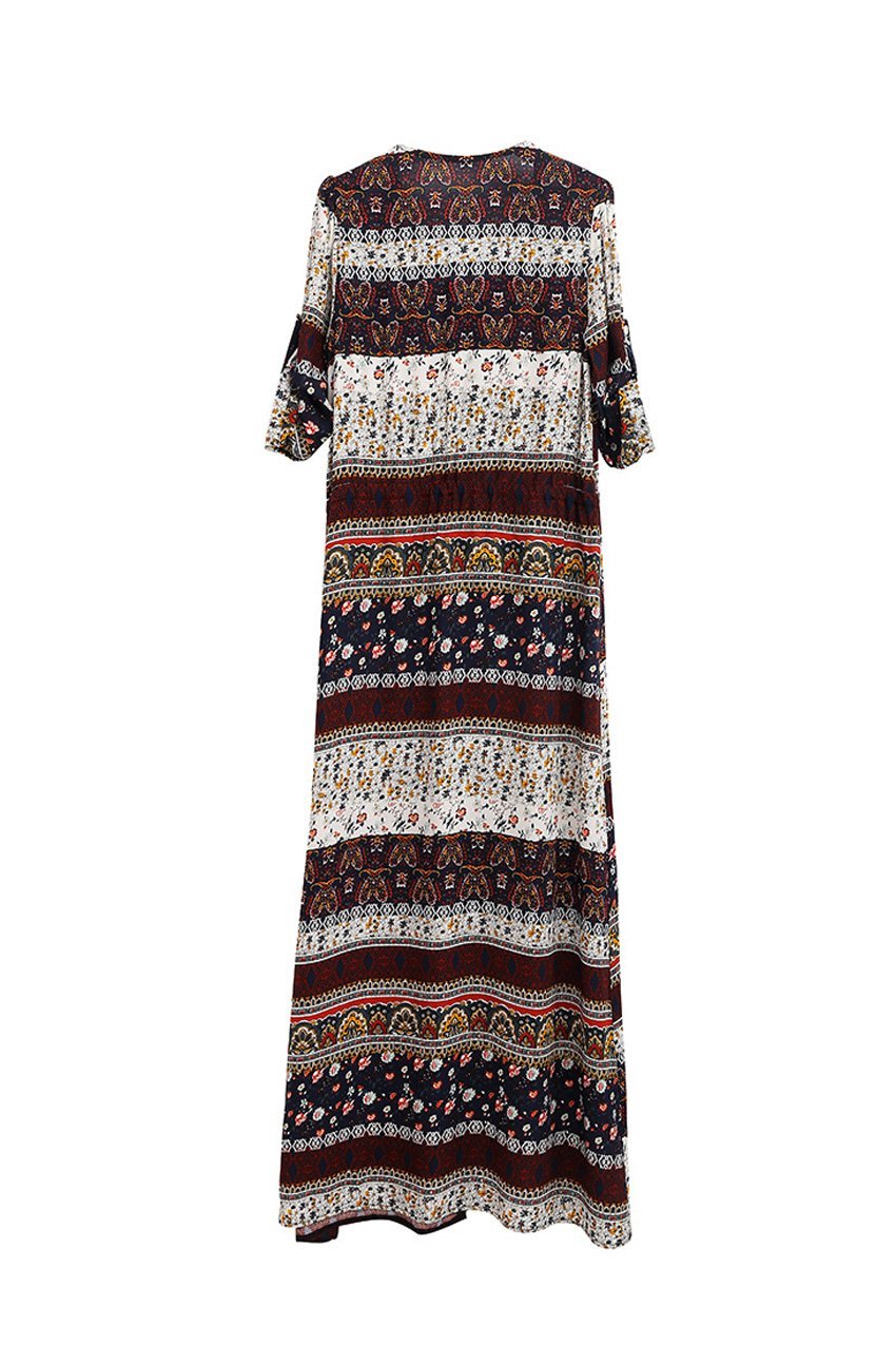 Bohemian style maxi dress featuring lonline shirt dress styling, allover ethnic printed, v neck, elbow sleeve and drawstring waist, button placket with splited front, have a good beach summer holiday with this perfect beachwear.