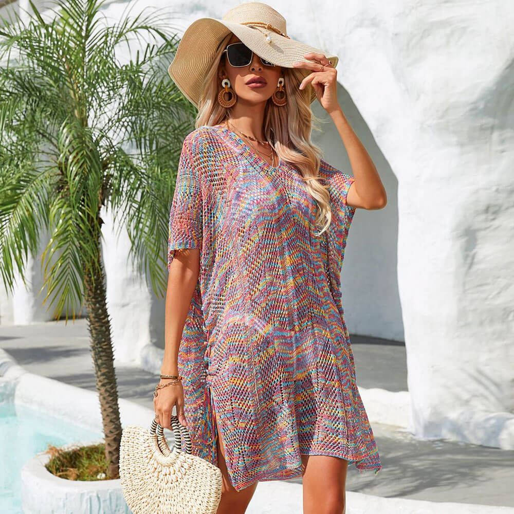 Elevate your beach look with this colorful tie-dye cover up dress! Its relaxed shape and ladder stitching give you a semi-sheer look that's perfect for any beach party. Its V-neckline and wide-cuff short sleeves and pastel patterns exude femininity, while the lace-up closure at both sides completes its sizzling style. This lightweight piece packs a big punch - perfect for wearing from day to night! Show your fearless style with this effortlessly chic knit cover up dress. Dare to be bold!