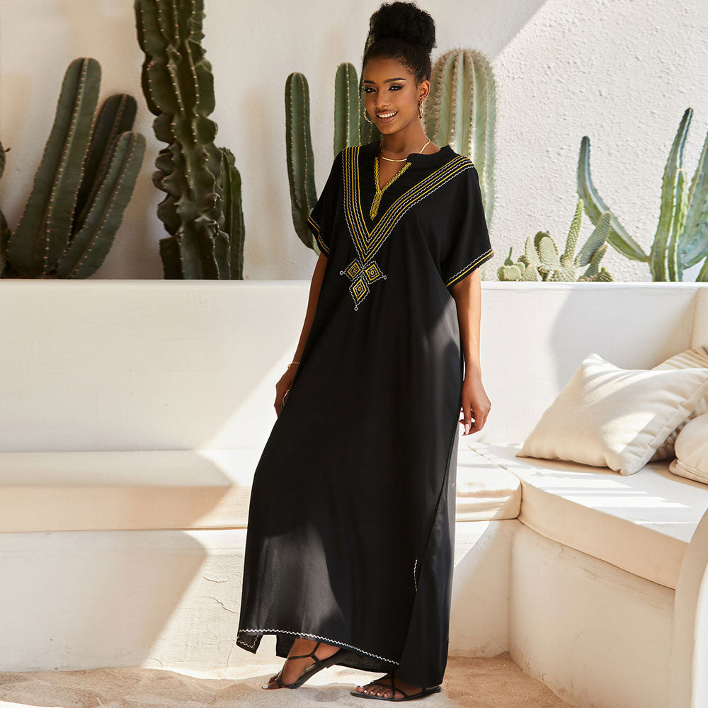 Adorned with exquisite bicolor geometric embroidery at the front, this caftan goes beyond being a mere cover-up. The statement wide V-neckline and casual short sleeves effortlessly elevate your look. The shapeless silhouette with side slits in a long hemline provides comfort and style. The simple maxi dress you'll reach for all the summer time.