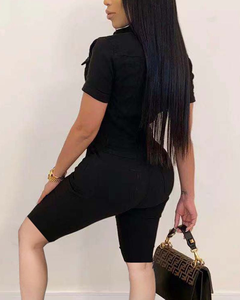 Button Front Flap Pocket Collar Romper