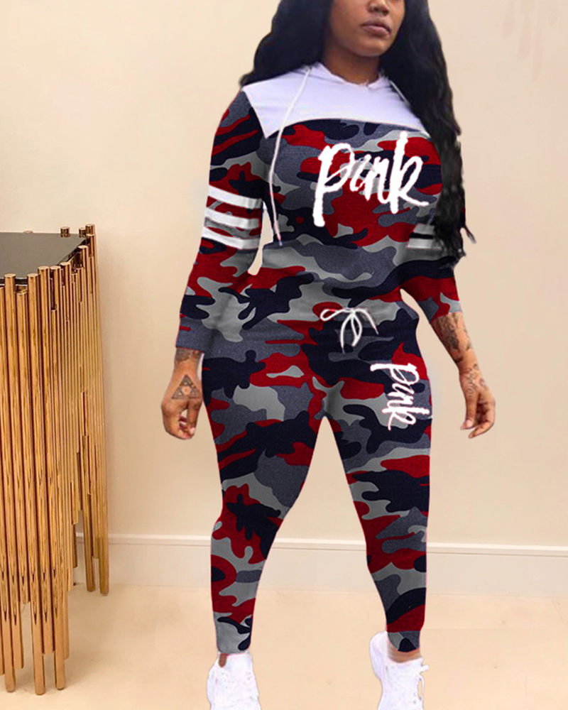 Camo & Letter Print Drawstring Hooded Top & Pants Set