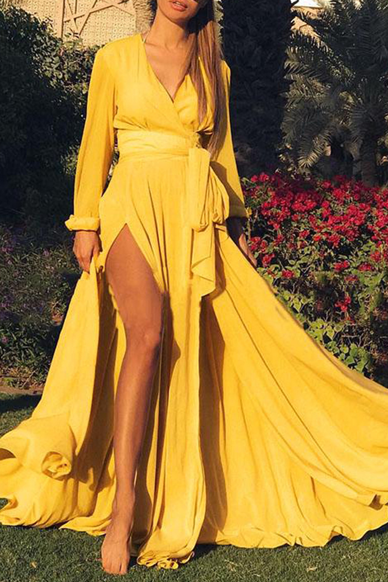 Casual Solid Slit V Neck Waist Skirt Dresses(3 Colors)