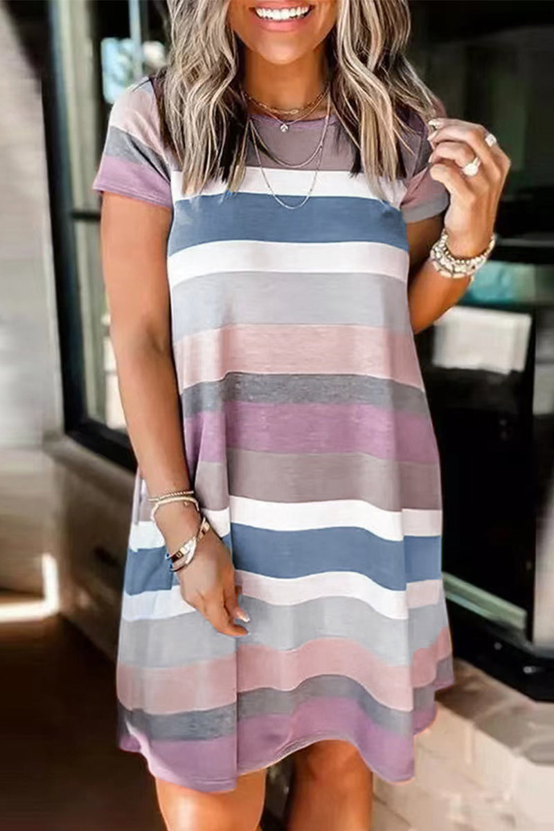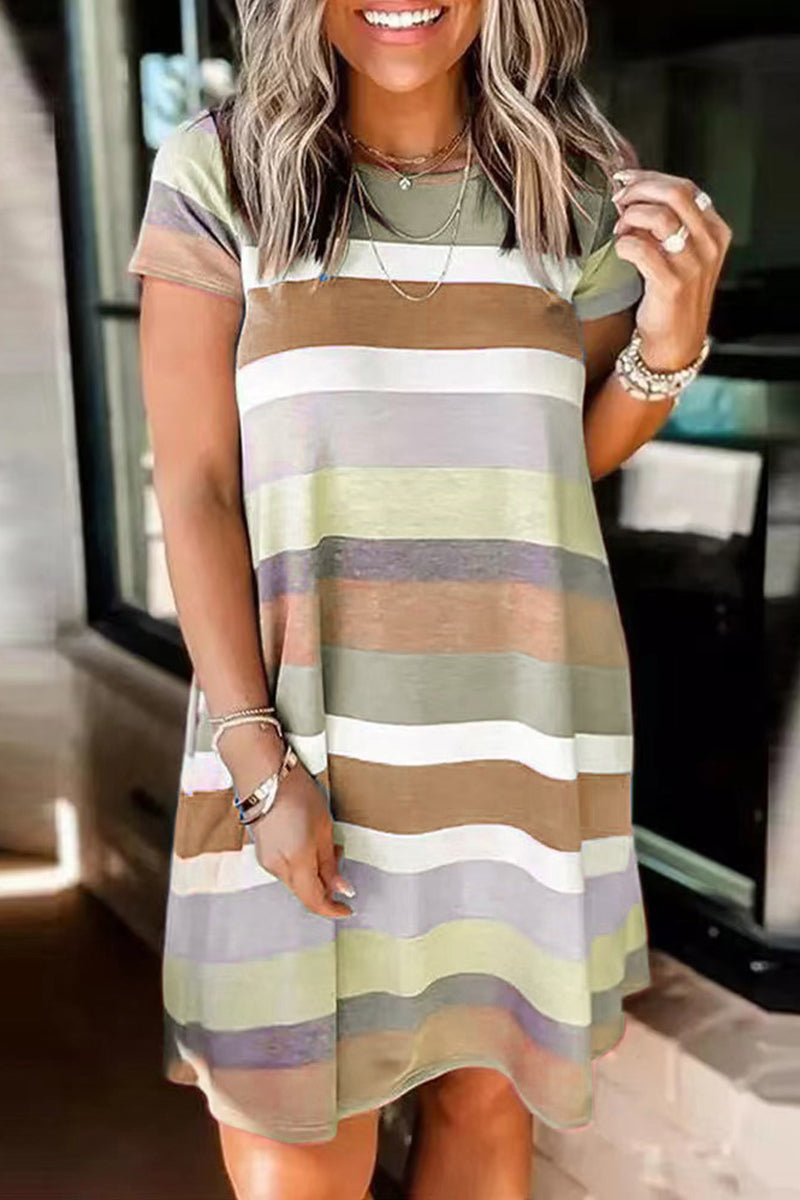 Casual Street Striped Patchwork Pocket O Neck T-shirt Dress Short Sleeve Dress(5 Colors)