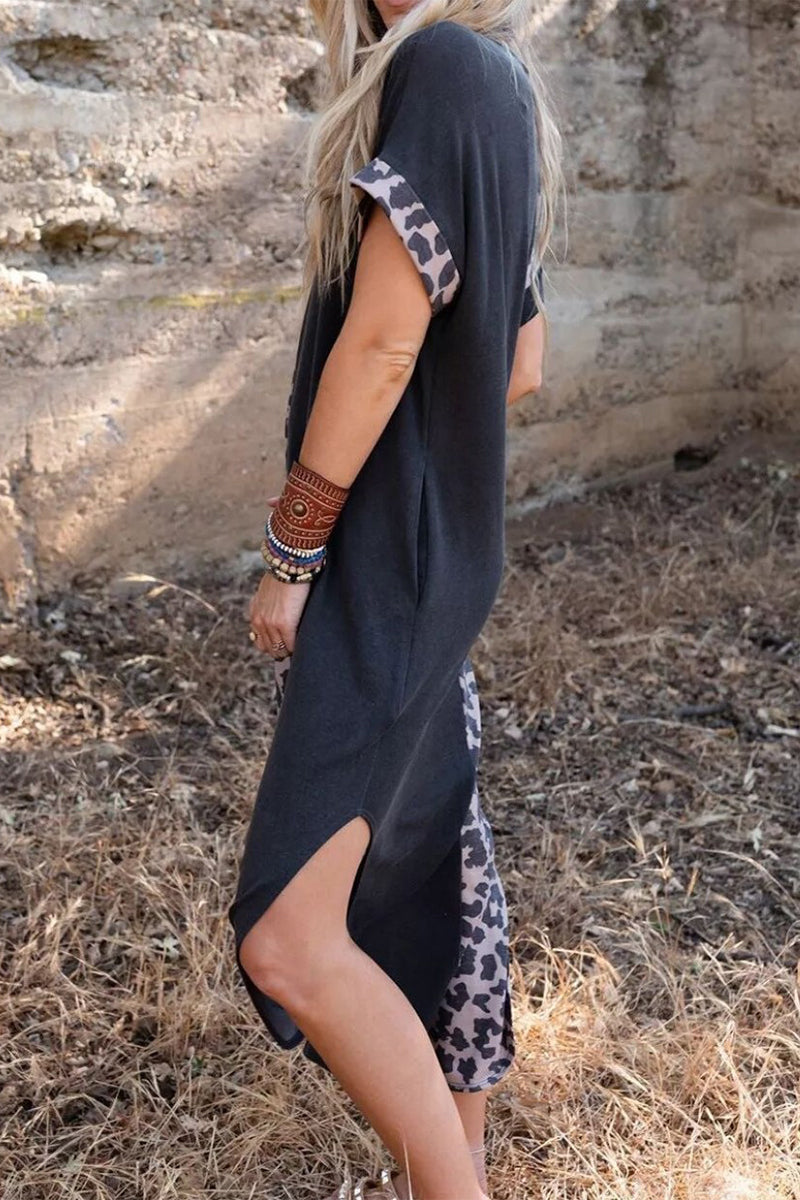 Casual Vintage Leopard Pocket Asymmetrical O Neck A Line Dresses(3 Colors)