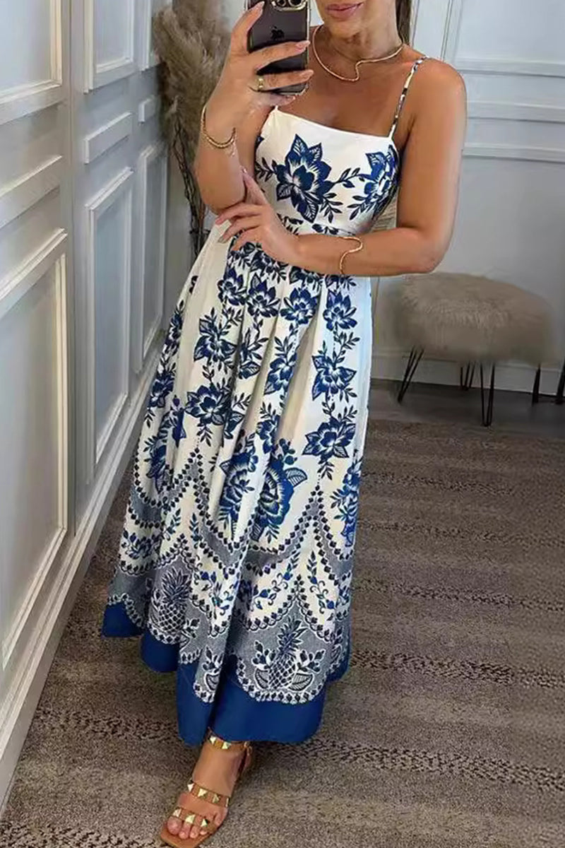 Casual Vintage Print Flowers Patchwork Square Collar Printed Dress Dresses