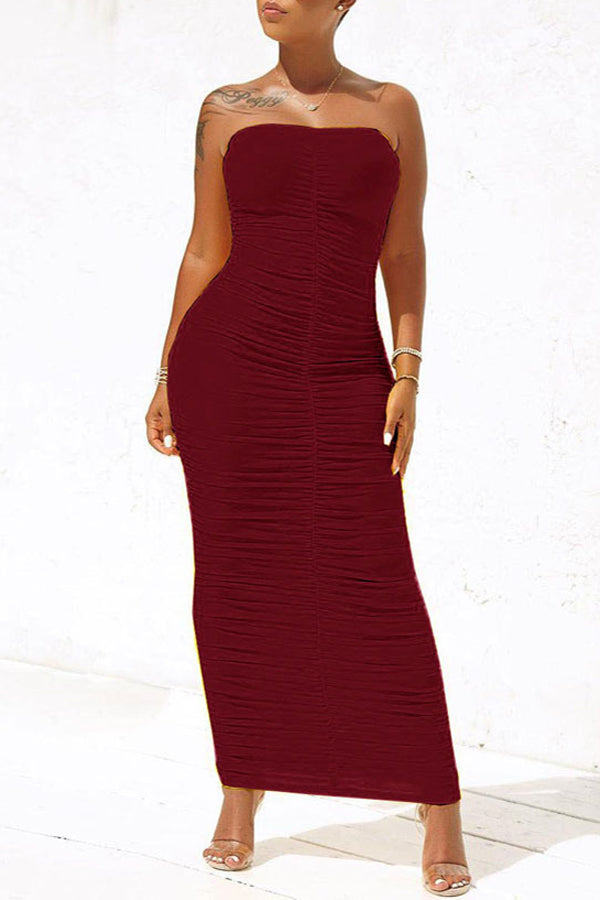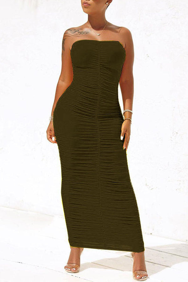 Casual Wrap Chest Sleeveless Crinkled High Stretch Slim Fit Long Dress