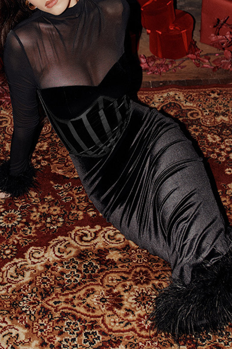 Celebrities Elegant Solid Feathers Turtleneck Waist Skirt Dresses