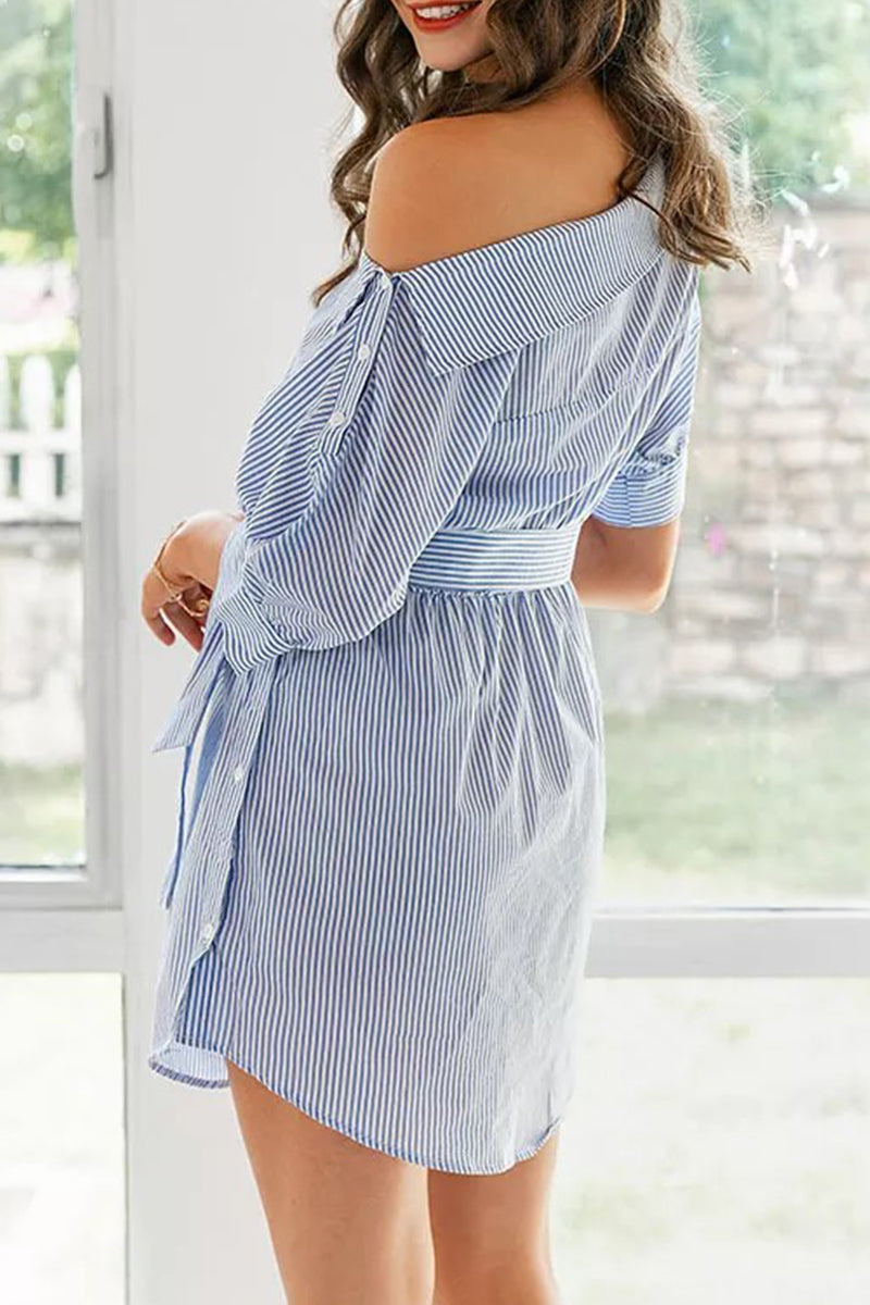 Celebrities Elegant Striped Patchwork Frenulum Oblique Collar Irregular Dress Dresses