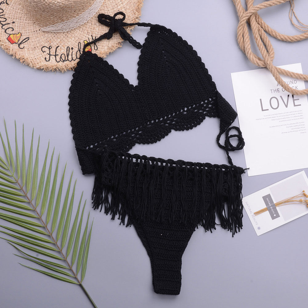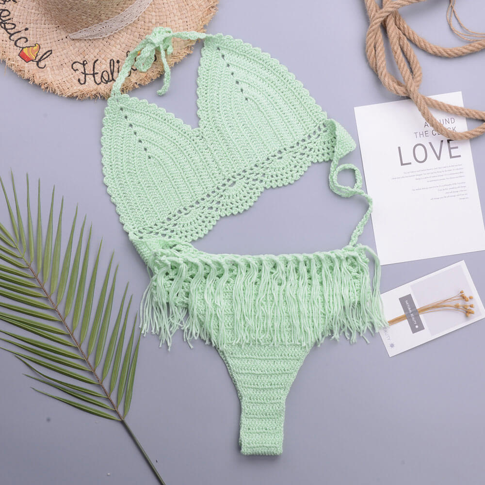 Chic Crochet Knit Tassel Trim Halter Triangle Brazilian Two Piece Bikini Swimsuit