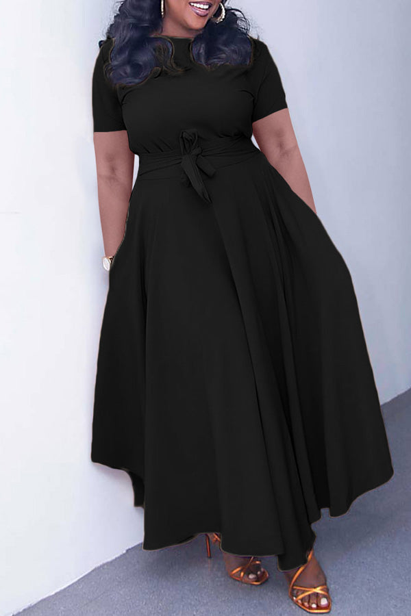 Classic Solid Color Short Sleeve Lace-Up A-Line Maxi Dress