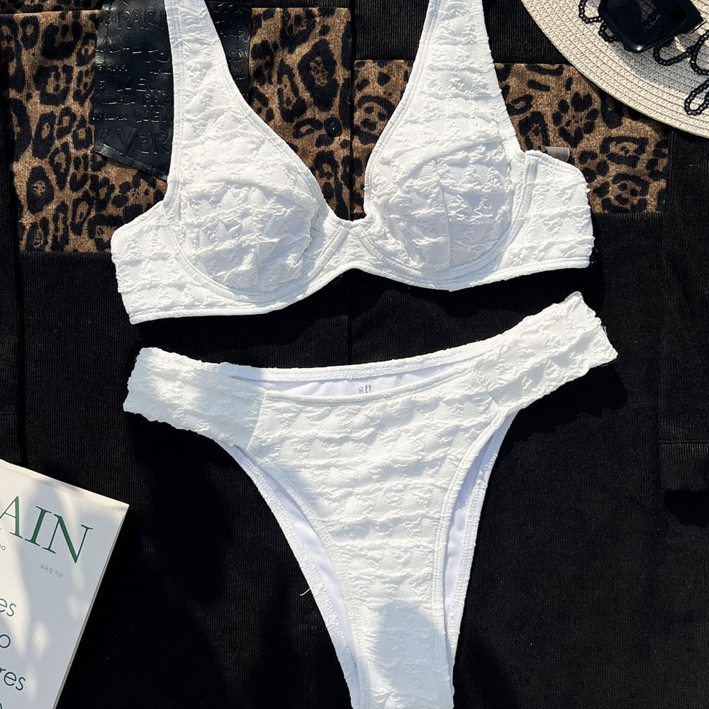 Classy Textured High Cut Cheeky Underwire Brazilian Two Piece Bikini Swimsuit